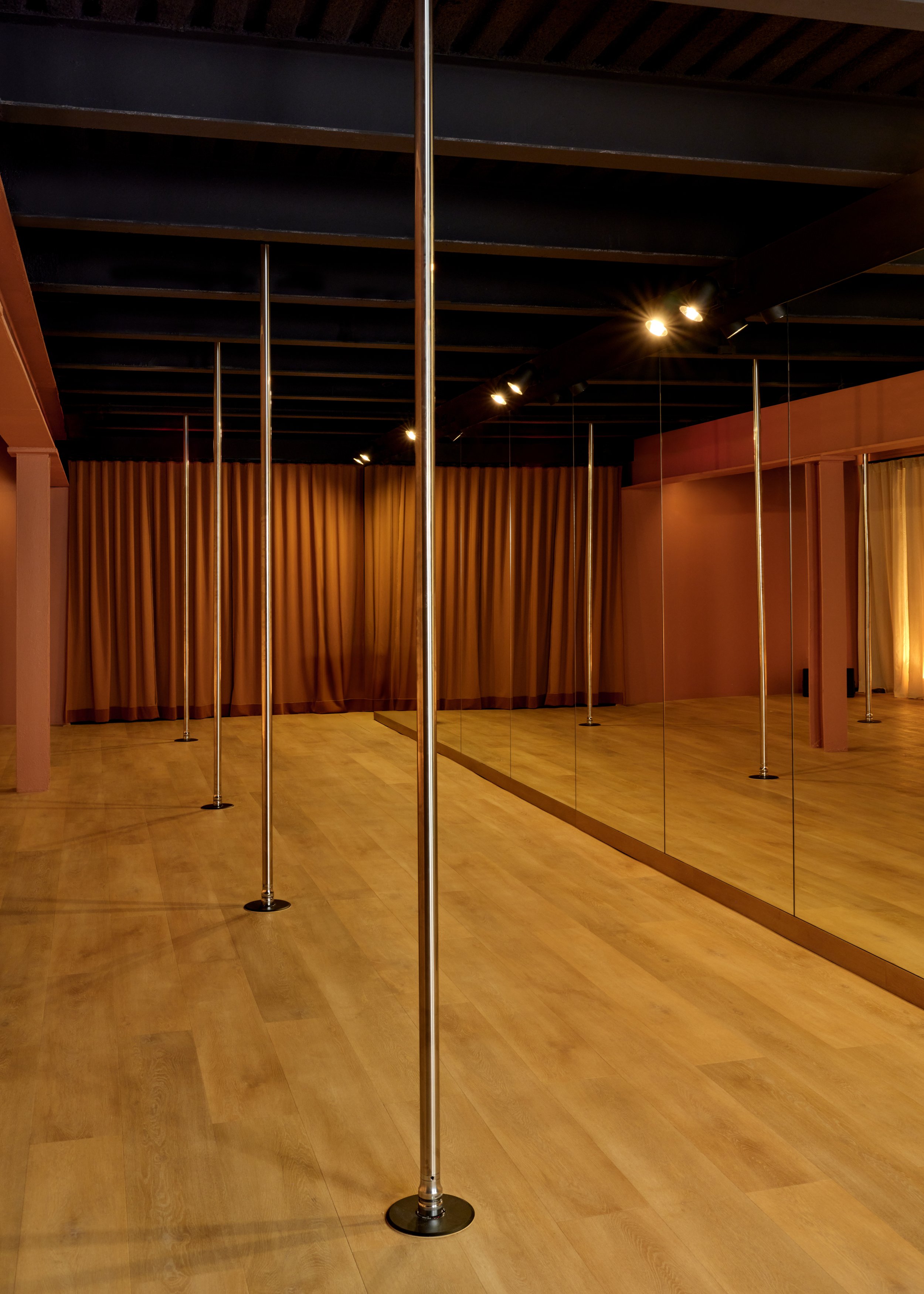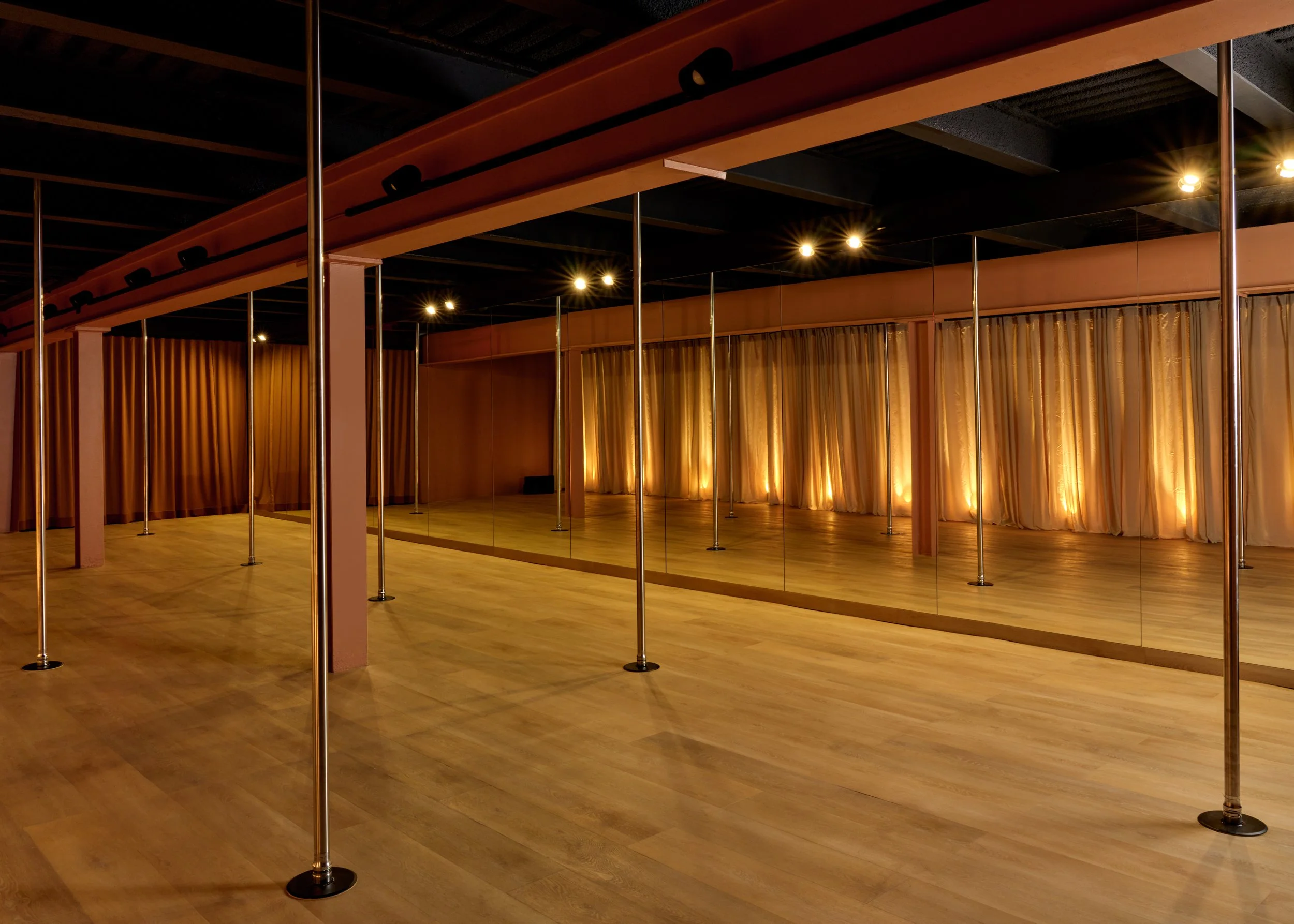 Housed within a newly finished two-story space, this warm and meticulously designed pole dance studio blends modern architecture with cinematic atmosphere. Each floor can be activated individually or together, offering contrasting moods that invite creativity—from the soft, amber-lit intimacy of the lower level to the expansive mirrored openness above.